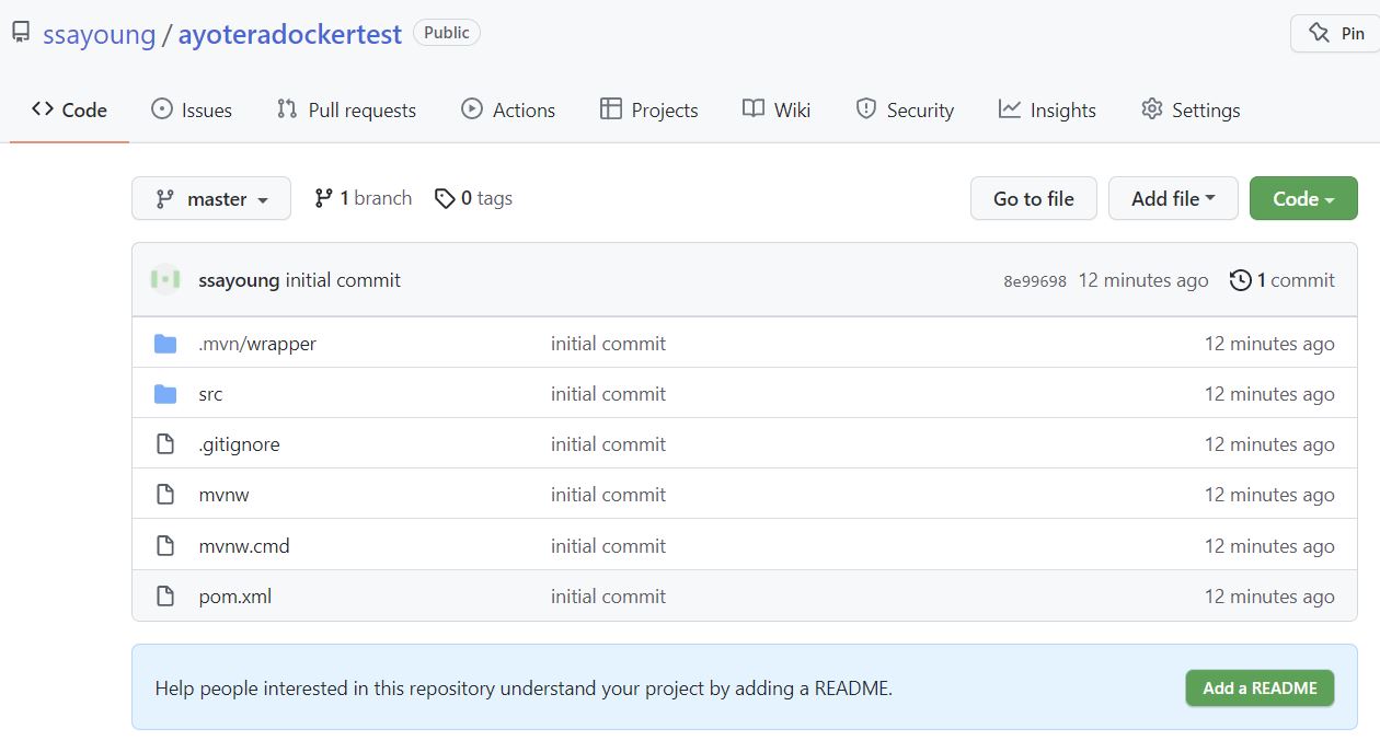 그렇다면 GitHub에 들어가볼까요?? 아래와 같이 ayoteradockertest repository가 생겨있고, 들어가보면 mater branch에 정상적으로 소스가 올라가 있음을 확인할 수 있습니다.