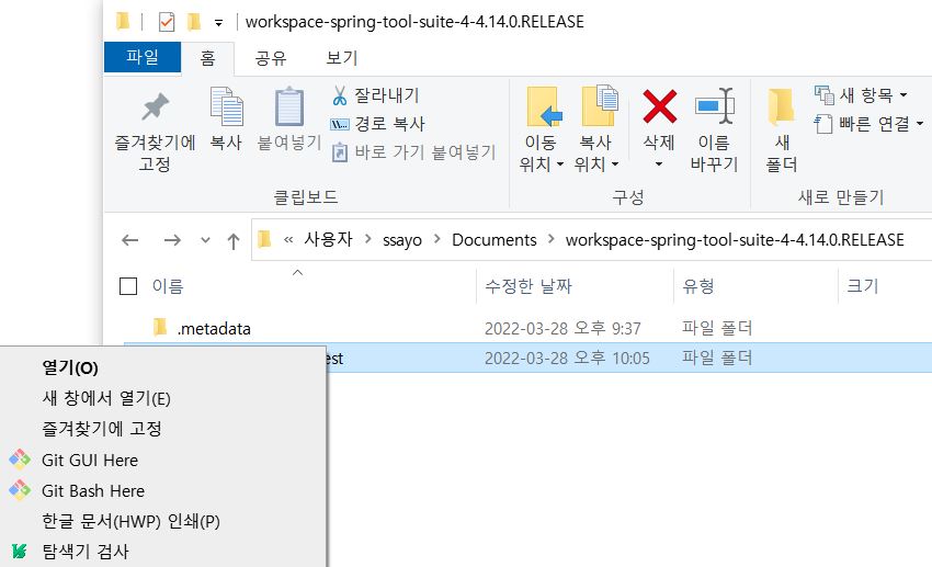 실제로 Git설치 부터 GitHub에 최초 소스를 commit하는 방법은 위의 링크를 통해서 확인해 주시면 되는데, 그래도 한번 간략하게 기술해 보겠습니다. 우선 해당 project의 workspace로 들어가서 해당 폴더에 마우스 오른쪽을 눌러줍니다. 그럼 여러개의 메뉴가 뜨는데 그 중에서 [Git bash Here]를 선택해 줍니다.