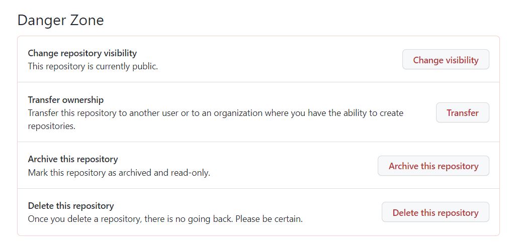 그럼 딱보면 여러가지 설정만 하는거 처럼 보이는데... 마우스를 아주 아래까지 휠을 돌려보면... 제일밑에 다음과 같이 Danger Zone이라고 해서 [Delete this repository] 라는 버튼을 찾을 수 있습니다. 해당 버튼을 누르면 깔끔하게 삭제가 됩니다.