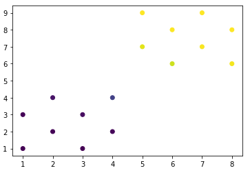 2차원 좌표에 여러개의 점을찍었다고 생각하고, 어느정도 비슷한 그룹에 있는 점들에 동일한 종속변수를 부여하겠습니다. 해당 Dataset과 이를 matplotlib로 그려보면 아래와 같습니다.