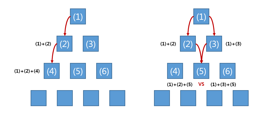 - 어느 한 지점의 값은, 자기에게 영향을 주는 바로 위의 계산결과 값과 자신의 합이 그 지점의 값이고,