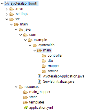 java 영역에는 controller / dto / mapper / service폴더를 만들어주고, resource 영역에는 xml을 위한 main_mapper를 만들어 줍니다. 이제 다됬습니다. 사실은 이렇게 구성만 한다고 Spring Boot가 다 알아주는 것이 아닙니다. 왜냐하면, 저기 폴더들은 사용자가 마음대로 만들었기 때문입니다.
