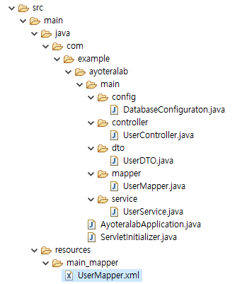 xml과 매핑되는 mapper.java의 namespace 작성 - "com.example.ayoteralab.main.mapper.UserMapper"