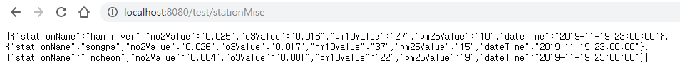 RequestMethod는 POST로 지정하고, GET과 유사하게 작성해줍니다. 단, body에 입력된 값을 받아와야 하기 때문에, Spring Annotation을 하나 추가해줍니다. @RequestBody Entity명 entity로 해줍니다. 저는 그냥 간단하게 기존에 작성했던 StationMiseDTO.java를 사용했습니다.