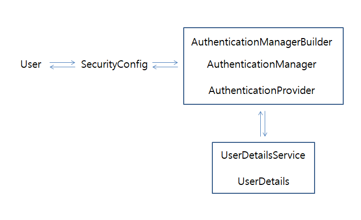 사용자는 아무것도 모르고 그냥 원하는 페이지 혹은 로그인페이지에 접근합니다. 그럼 그 이후부터 동작로직은 Spring Boot 프로젝트 내에서 SecurityConfig에 설정한 내용으로 모두 관리가 됩니다. 그 뒷단에서 인증에 대한 부분을 책임지는 Authentication... 그리고 DB에서 사용자 정보를 가져오고 사용자가 입력한 정보를 비교하여 승인하는 등의 실질적인 로직이 들어가는 UserDetails... 부분이 작성됩니다.