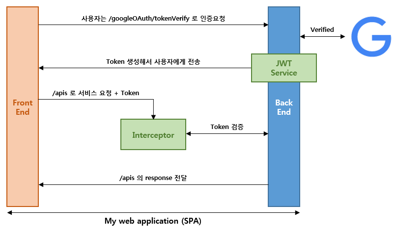 이번에는 그 이후에 사용자가 Front-End를 통해서 Token을 header에 추가하여 API를 요청할 때, Token을 확인하고 유효할 경우 서비스를 제공하는 단계를 진행해 보겠습니다. 전체적인 그림은 이전에도 보셨지만 아래와 같고, /apis로 서비스 요청 + Token부터 그 이하에 대한 부분의 적용이 되겠습니다.