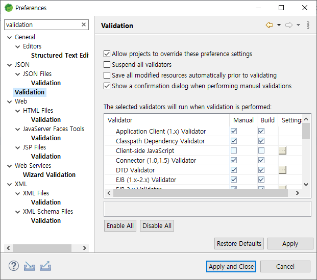 해당화면에서 스크롤을 돌려보면 아래 항목에 Manual / Build 부분이 체크가 되어있는데 체크를 해제하고 Apply 후 Apply and Close해주면 됩니다.
