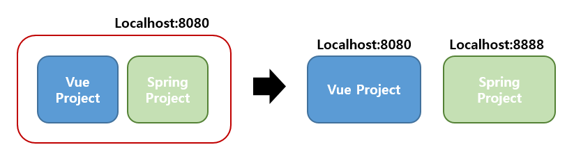 이제는 위의 그림과 같이 구성을 바꿔보겠습니다. vue project는 그대로 두고... springboot project에서 구동하는 서버의 포트를 변경하겠습니다.