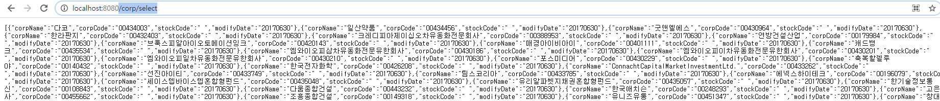 우선 corp_code의 테이블에서 select를 통해 전체 리스트를 제공하는 API는 해당 프로젝트의 backend부분에 작성이 되어있으며, 해당 url은 http://localhost:8080/corp/select 입니다.