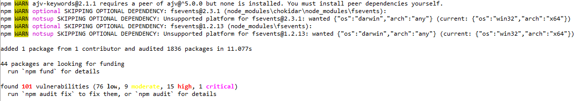중간에 axios정보가 있음을 확인했습니다. 현재 npm repository를 통해서 확인한 현재 버전이 0.21.1이기 때문에 작성을 했고, 향후 install시 더 높은 버전이 있다면 그것이 설치될 것 입니다.
