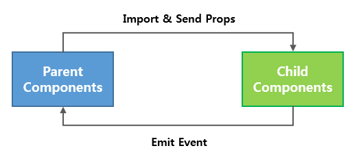 Parent Components는 Child Components를 import하고 Props를 설정하여 데이터를 보낼 수 있으며, Child Components는 Emit Event를 통해서 Parent Components에 데이터를 전달할 수 있습니다. 바로 전에 ChartTest를 진행할 때에도... 이 Components를 사용해서 구현했었는데요.