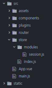 store의 구조는 위와 같습니다. 우선 store.js를 추가하고 main.js에서는 해당 js를 기존에 axios를 추가하는 방식으로 구현해 보겠습니다.