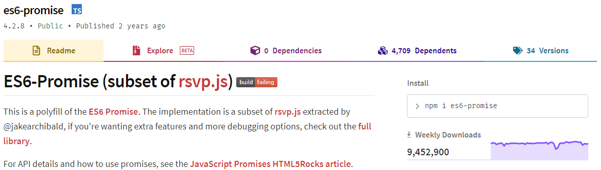 추가적으로 Vuex는 비동기처리를 위한 Promise를 필요로 합니다. 만약에 IE까지 지원대상으로 포함을 한다면... polyfill library가 필요합니다. 따라서 es6-promise를 추가로 설치하도록 하겠습니다. 역시나 npm repository에서 찾아봅니다.