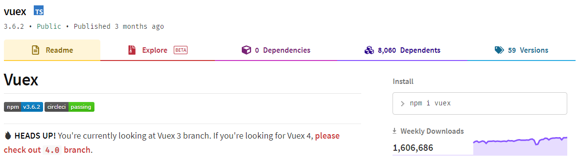 설치를 위해서는 우선 npm repository에서 Vuex를 검색해 줍니다. 그리고 현재 버전등을 확인해서 아래와 같이 package.json에 dependency를 추가해 줍니다.