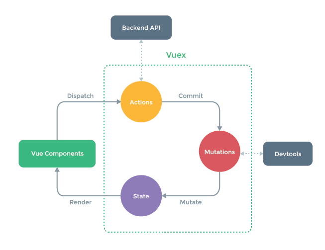 Vuex는 위과 같이 크게 3가지 모듈로 구성이 되어있습니다. 이 모든 모듈은 저장소라고하는 store내에 구성이 됩니다. 그리고 화살표로 볼 수 있듯이 단방향으로 데이터 흐름이 됨을 확인할 수 있습니다. 각 모듈에 대해서 약간 자세히 알아보면...